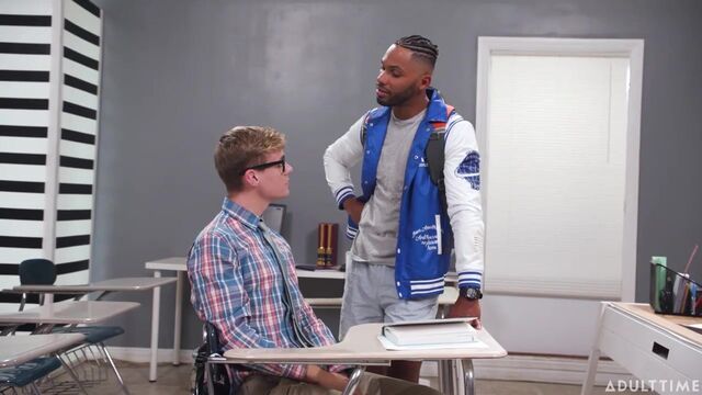 Jack Bailey, the last student to leave the classroom, grabs his backpack and is about to head out the door when one of the school's football players, Tony Genius, comes in and asks Jack for tutoring. Tony says that his grades have reached a point where if he doesn't get a B+ he'll be held back a year, and there's NO WAY that can happen.While Jack is enthralled by Tony's muscles, he explains that, unfortunately, at the moment he's too busy. It's nearing final exam time, so he's had more tutoring requests than usual, and has to take them first-come-first-served. Tony, having caught Jack looking at his muscles and knowing that he's gay, decides to try and use this to his advantage. He tries stretching to show off his abs while putting a hand on Jack's shoulder, desperately adding that he'll let Jack suck his dick if he helps out.This is a dream come true for Jack, who milks the opportunity by saying that sounds good but he's VERY busy, so he wants more than just sucking dick...Soon enough, they are passionately fucking in the classroom but Jack's shocked when Tony's jock friends show up unannounced, also wanting help. Once Tony invites them to join, Jack's over the moon! It looks like Jack's in for a loooong weekend of tutoring.