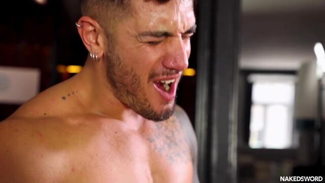 International porn star Alex Palmieri is in Portugal and on his knees as he swallows down the big dick of tattooed hunk Alex Ink. Ink returns the favor by jamming his face between Palmieri's meaty cakes and rimming his hole before sliding in his uncut rod to bareback the muscle hunk's perfect ass. After pounding out Palmieri all over the dining room, Ink's hot cock goes from Palmieri's ass to his mouth and delivers a creamy load directly onto the beefcake's tongue.
