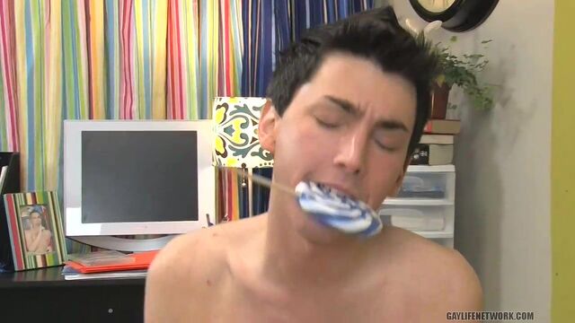The hardcore scene between Colby London and Skyelr Bleu starts with them sucking on a lollipop and resting in bed. The sugary treat is big and colorful and all that licking and sucking turns them on to the point that a good hardcore fuck is inevitable. Colby is quite the cocksucker and his oral skills are very much appreciated by Skyelr, a top twink that loves to fuck a tight ass. The BJ gets him to that place and the anal fucking isn't far behind. The doggy style is particularly hot since much of it is filmed from behind with a perfect view of the anal entrance.