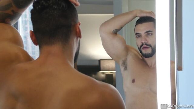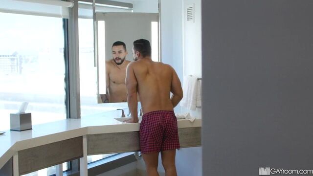 Sneaky, horny bottom joins muscle jock in the shower for a steamy and slippery ass pounding.