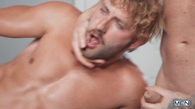 Spa employee Jackson Cooks is bored... until two super-hot studs walk into his coworker's studio for a massage! Jackson's friend chases him out, but he sneaks back to crawl under the tables and suck Filou Fitt and Javao's hard cocks, milking them as they cum all over him. When the masseuse leaves the room, Jackson demands both those dicks, and the tops are happy to oblige! They spit-roast the curly-haired bottom, taking turns drilling his ass and his throat, and he rides Javao before taking a double load on his face.