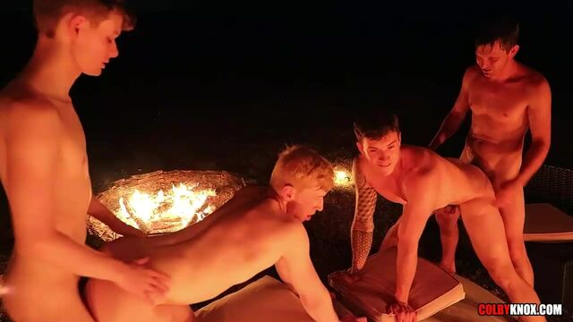 - Description: Last week, husbands Colby Chambers and Mickey Knox put their hot tub to good use by having an orgy with Ethan Adams and Finn August. This week, hunks Gabe Hayes and Jesse Stone join the quartet of studs. It’s nighttime, all the boys are in front of a fire pit. Mickey snacks on Gabe’s ass; Gabe swallows Ethan’s tool; Jesse slathers lube on his dick; and Finn takes care of Colby’s cock. Colby, ever the good host, strokes Jesse’s slippery shaft. Jesse is more than ready to plunge into tasty cake so he gets behind Finn. He continues to slobber on Colby’s rod as Jesse stuffs his backside. “Take that fucking dick,” Colby whispers. “It feels so fucking good,” Finn moans. Mickey moves from Gabe’s rear to his front. This offers Gabe an opportunity to suck Ethan and Mickey off. Gabe then gets a chance to stand over Ethan so they can lock lips. As for Mickey, he blows Ethan. As we all know, Colby isn’t going to let a bouncy booty go without getting plugged. :-) So Finn takes a seat on Colby’s thick tool. He stands up to get a better angle at Finn’s buns. As Colby pounds Finn, Ethan gets behind Mickey. “Your dick feels so good in my ass,” Mickey says with a grin. He moans into Jesse’s neck as Jesse and Finn kiss. Can’t forget Gabe. He’s intrigued by Ethan’s backside. He slides into Ethan’s hole, making an “Ethan sandwich.” Ethan and Gabe decide to sit on a chair to make out. Micky’s hole isn’t empty for long. Jesse gets behind him, making those cheeks sing. When Mickey gets on his back, and puts his legs in the air, Colby gives his man a deep dicking. Ethan gets on his hands and knees, sucking Gabe with gusto. Finn does the same to Jesse. However, Finn wants more meat in his ass so he rides Jesse. After a few strokes, Finn gets on his hands and knees. Jesse re-enters, pounding to the balls. Gabe offers Ethan his mouth. “You’re so good at that,” Ethan observes when Gabe comes up for air. Colby’s man whimpers and moans because his “special spot” is smashed just the way he likes. Colby also feels good, so much that he pulls out and dumps a hot load of man juice on Mickey’s stomach. Jesse has topped too much this evening. “Want to be topped by a little twink.” Ethan wonders. Jesse gets on all fours. Ethan lubes up and enters the backdoor. Mickey’s wood remains stiff. He puts some spit on Finn’s hole and pushes inside. Finn and Jesse smooch as their holes are ravaged. Jesse and Ethan untangle so Jesse can suck Ethan’s cock. As that is happening, Gabe and Finn kiss. Mickey loves all the passion he sees, stroking his dick. He gets behind Jesse, licking the sweaty plump peach. The fire light is perfect on the toned bodies. Moans mingle with the chorus of crickets. “God. I’m going to cum,” Ethan announces. Jesse keeps sucking and Ethan busts a load of man milk. Jesse strokes the tool. Then licks what’s left.