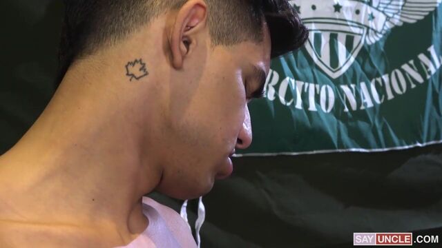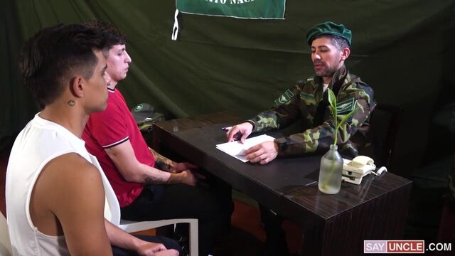 When Bautista and Felix are left with the choice between prison and military service, they decide to submit themselves to Commander Nick. But things won’t be as simple and patriotic as just committing themselves to their country. Instead, Nick has much more intense ideas for these new soldiers. They’ve caused crime and trouble, which has led them here, and now Nick is going to use his authority over them to set them straight - well, not that straight. Nick commands Bautista and Felix to strip naked, and he can see that his power over them obviously makes them horny. Their dicks are getting harder by the second, and they try to ignore it, but Nick is going to make sure they can’t ignore their growing hard-ons. Their leader makes them tug on their stiff cocks, and he gets to watch. The fun amplifies when they start blowing each other, with Nick getting in on the action, too. He’s their leader, after all, and if someone should have their dick sucked, it’s the authority figure. The commander shows no mercy when he crams his throbbing shaft inside their tight holes. He needs to make sure they understand just how demanding and intense this military program is, and nothing says discipline like a big load of hot frothing cum.