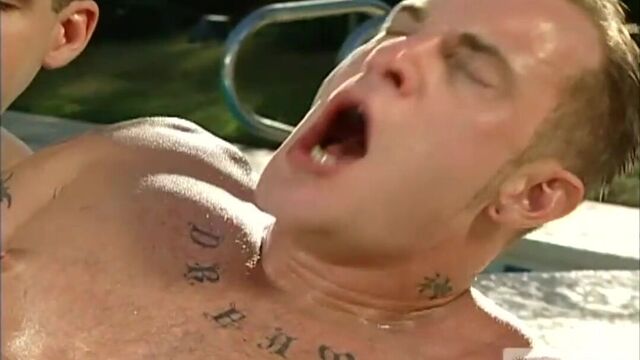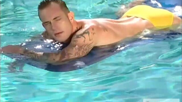 The hot bodies keep on coming in Scene 3 as Tony Mecelli pulls up to a lounge chair and begins to oil up his massive muscles. Nick Piston watches the show from a raft in the pool and swims closer when Tony whips out his 10 inch rod from beneath his Speedo. Piston dives onto the prick with his mouth and begins to tease it, licking and sucking with his mouth. We're not sure what drives us wild the most about Piston: his low guttural voice, the sexy set of tattoos on his body, the unbelievably talented big round ass, or his really huge fat cock that swings between his legs as he fucks himself on Tony's shaft. The sex in this scene is one long, langorous suck and fuckathon luxuriously shot with the majestic Palm Spring mountains in the background. Porn just doesn't get any hotter!