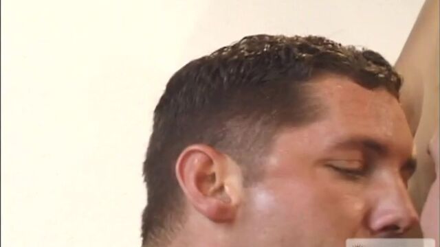 Next up is an outdoor scene, in which the beautiful Nick Moore tends to the cock of ruggedly handsome Mark Mason, taking Mason's cock down his throat over and over again as his saliva builds up in his mouth. Mason then shows his own talent for cocksucking, chowing down on Moore's sizeable tool like he was born to do it. The two men trade off cocksucking again before Mason bends Moore over a concrete divider and slams his cock up inside the willing submissive's hole. For his part, Moore just clenches his teeth and takes it, his eyes winced into a look of pleasure mixed with glorious pain. Then Mason lies on his back while Moore licks his balls and gets a hot load on his face. Mmmm, dinner!
