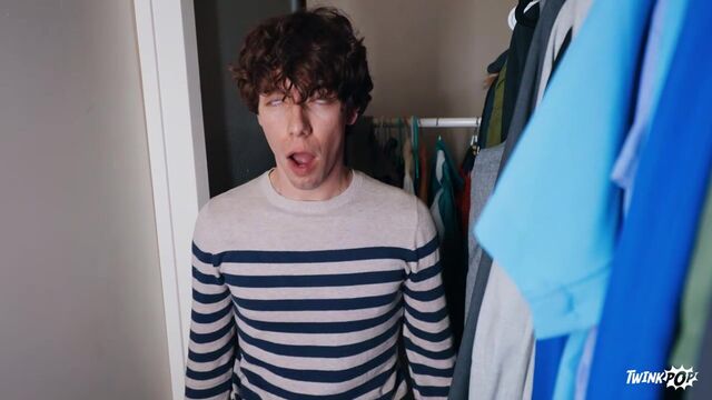 Cristiano brings his boyfriend Sam Ledger to his stepdad's place to hook up, thinking it's empty, but just as they start getting hot and heavy on the bed, they hear Reese Rideout come in! The twinks quickly hide in the closet, peeking out as Reese strips down, takes out his MenSexGear Gloryhole stroker and lube, and settles in for a self-pleasure session. The twinks suck each other in the closet as they watch, and when the coast is clear, Cristiano rims the bottom on the bed, then fucks his hole. Sam takes that dick in spoon and doggystyle position, cumming as the top pounds him on his back. Cristiano pulls out to shoot a huge load, then licks it off.