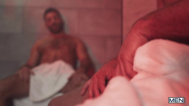 Sumner Blayne walks past Levi in the locker room at the bath house, and the hunks eye each other. Blond Sumner has a seat in the steam room, and dark-haired Levi follows, getting an eyeful as Sumner drops his towel and strokes his cock. Soon both guys are touching themselves, but Levi makes the first move, swallowing Sumner's dick. The bottom returns the favor, and the guys frot before Levi fucks him against the wall. Sumner hops in the pool to suck the top, then rides him. Levi cums as he drills the bottom from behind, but he's still hard and fucks a load out of Sumner in missionary!