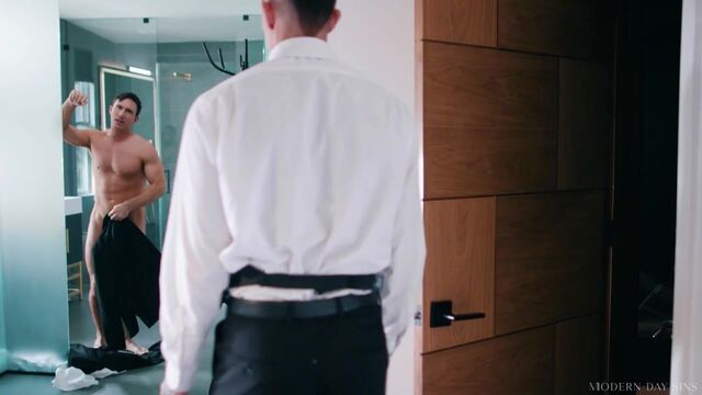 Brock Banks is getting ready for his wedding with Vincent O'Reilly while his straight best man, Reese Rideout, keeps him company. Brock adjusts his cuffs and smooths out his tux, asking Reese if he looks prepared for his big day. Reese gives him a soothing pat on the back, assuring Brock that he looks ravishing. Despite his supportive energy, Reese can't help but seem conflicted about something.When Brock muses that he might be able to find Reese a girl to hook up with at the wedding, Reese shockingly reveals that he isn't interested in girls. In fact, he isn't interested in anyone else but Brock himself. He thinks that Brock is making a mistake, and declares his love for him. Brock is taken aback- he never knew that Reese was gay and this really isn't the BEST time to reveal his affections to him. Though Brock does admits that he's attracted to Reese, it's too late now to act on that attraction. He's getting married in an hour. But Reese is persistent, and Brock finally gives in.They kiss and over-the-clothes grope each other. They start unbuttoning their shirts and kissing their chests and neck as their hands wander down to their crotches. Just then, there's a knock at the door- it's Vincent. Brock shoos Reese away and reminds Vincent that they aren't supposed to see each other before the ceremony. Vincent assures Brock that he won't come in, making sure to stay on the other side of the door. Vincent seems nervous, as if something is on his mind, but seems to decide that it's not worth bringing up and excuses himself.Though that certainly was a close call, Brock and Reese quickly pick up where they left off, continuing to kiss and grope each other. Brock gets on his knees and gives Reese a blowjob, and then Reese returns the favor. It's his first time sucking a dick, but he's a natural at it and Brock can't help but moan with delight. They then get fully undressed, and Reese tops Brock in doggystyle against the bathroom sink. Eventually, there is another knock on the door and Vincent begins to enter the room. Brock hides and Vincent finds Reese naked. Vincent's looking for Brock, and Reese lies that Brock went to find a missing article of clothing at the venue. Vincent seems convinced and leaves the room again.Brock and Reese have dodged disaster again, but that doesn't mean they've learned their lesson. They get back into doggystyle, with Reese topping Brock again. Reese fucks Brock until he cums all over his ass cheeks. They kiss, totally satisfied, and Brock decides that he should go tell Vincent that he's going to call off the wedding.A few moments later, Brock and Vincent sit on the bed and have a little chat. To Brock's surprise, Vincent ALSO wants to call off the wedding. Brock is relieved, though he doesn't admit to what he did with Reese. He assures Vincent that he will take care of canceling everything, and with a sigh of release, they kiss. This gets them hot and bothered as they start making out and taking off their clothes. They give each other blowjobs and then Vincent gets into a doggystyle position on his knees and lets Brock rim him. Brock then fucks Vincent in doggystyle, after which Vincent climbs onto him in cowboy and rides him on the bed. Vincent flips onto his back and Brock tops him in missionary while Vincent jerks himself off. Both men finish the act with a pulsing, throbbing climax, putting this story- and all its mistakes- to rest.