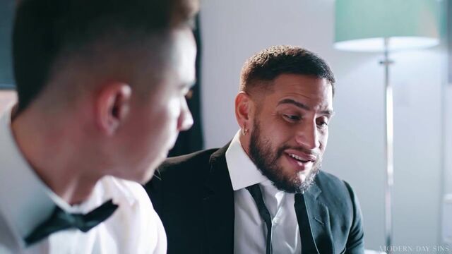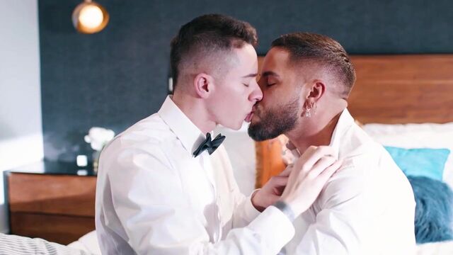 - Description: Brock Banks is getting ready for his wedding with Vincent O'Reilly while his straight best man, Reese Rideout, keeps him company. Brock adjusts his cuffs and smooths out his tux, asking Reese if he looks prepared for his big day. Reese gives him a soothing pat on the back, assuring Brock that he looks ravishing. Despite his supportive energy, Reese can't help but seem conflicted about something.When Brock muses that he might be able to find Reese a girl to hook up with at the wedding, Reese shockingly reveals that he isn't interested in girls. In fact, he isn't interested in anyone else but Brock himself. He thinks that Brock is making a mistake, and declares his love for him. Brock is taken aback- he never knew that Reese was gay and this really isn't the BEST time to reveal his affections to him. Though Brock does admits that he's attracted to Reese, it's too late now to act on that attraction. He's getting married in an hour. But Reese is persistent, and Brock finally gives in.They kiss and over-the-clothes grope each other. They start unbuttoning their shirts and kissing their chests and neck as their hands wander down to their crotches. Just then, there's a knock at the door- it's Vincent. Brock shoos Reese away and reminds Vincent that they aren't supposed to see each other before the ceremony. Vincent assures Brock that he won't come in, making sure to stay on the other side of the door. Vincent seems nervous, as if something is on his mind, but seems to decide that it's not worth bringing up and excuses himself.Though that certainly was a close call, Brock and Reese quickly pick up where they left off, continuing to kiss and grope each other. Brock gets on his knees and gives Reese a blowjob, and then Reese returns the favor. It's his first time sucking a dick, but he's a natural at it and Brock can't help but moan with delight. They then get fully undressed, and Reese tops Brock in doggystyle against the bathroom sink. Eventually, there is another knock on the door and Vincent begins to enter the room. Brock hides and Vincent finds Reese naked. Vincent's looking for Brock, and Reese lies that Brock went to find a missing article of clothing at the venue. Vincent seems convinced and leaves the room again.Brock and Reese have dodged disaster again, but that doesn't mean they've learned their lesson. They get back into doggystyle, with Reese topping Brock again. Reese fucks Brock until he cums all over his ass cheeks. They kiss, totally satisfied, and Brock decides that he should go tell Vincent that he's going to call off the wedding.A few moments later, Brock and Vincent sit on the bed and have a little chat. To Brock's surprise, Vincent ALSO wants to call off the wedding. Brock is relieved, though he doesn't admit to what he did with Reese. He assures Vincent that he will take care of canceling everything, and with a sigh of release, they kiss. This gets them hot and bothered as they start making out and taking off their clothes. They give each other blowjobs and then Vincent gets into a doggystyle position on his knees and lets Brock rim him. Brock then fucks Vincent in doggystyle, after which Vincent climbs onto him in cowboy and rides him on the bed. Vincent flips onto his back and Brock tops him in missionary while Vincent jerks himself off. Both men finish the act with a pulsing, throbbing climax, putting this story- and all its mistakes- to rest.