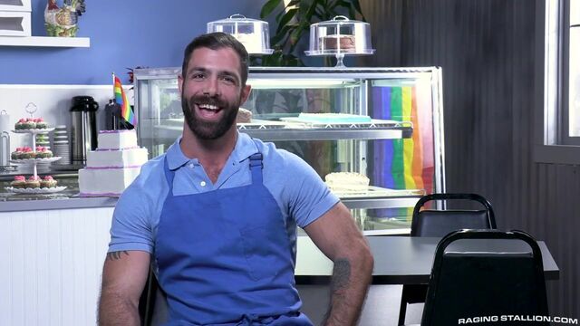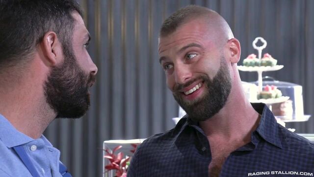 Cake Shop' owner, Jake Nicola greets his old flame Donnie Argento, who wants to surprise his husband, Sharok, with a special cake for their first anniversary. The secret ingredient he wants to add is his own jizz as the cream filling. Donnie is hot to trot and wants to extract it with Jake's help, but the chef wisely suggests that they include his man. Sharok arrives, and the horny trio convene in the bakery for a three-way, bareback flip fuck with Donnie nude in position on the counter: rock hard cock, beefy butt and perky hole at the ready. Jake and Sharok strip down and take turns eating his ass, especially after Donnie squats down on the special dessert and gets his own cakes covered in frosting. Licking him clean, the boys get him primed and ready for a raw, deep-dick fuck as Jake's thick prick pries Donnie's ass open, and Sharok's huge tool gets in for sweet, sloppy seconds. Donnie gives as good as he gets and he fucks his hubby hard, then climbs on the counter to sit on Jake while Sharok bangs the baker. Sharok blasts his seed in Jake's hairy hole till Jake blows a load on his furry belly, then guzzles Donnie's jizz in a cum-thirsty finish.