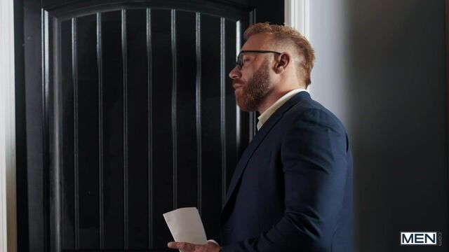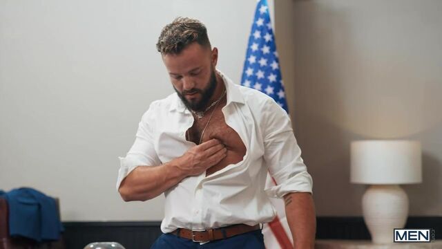 We've all been there: you're bored and horny, things get a little weird, and even the couch starts looking kind of sexy. Hayden Harding succumbs to the allure of his office sofa, shrugging out of his suit and grinding against the arm. He's so engrossed, he doesn't hear his aide, Brogan, knocking as he gets naked and prepares to use those cushions for some pushin'! Luckily, when Brogan walks in on his boss, he doesn't let that happen, sucking Hayden's cock instead before he rides him. Sofas are much better to fuck on than to fuck, so the bearded hunks take turns pounding each other on the furniture till the politician drills a load out of his aide and cums on Brogan's face.