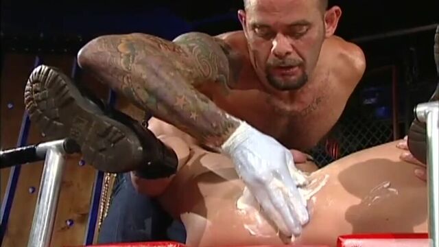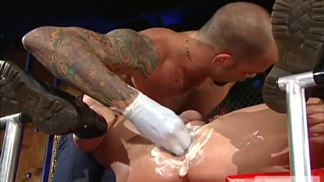 This full-length bonus scene begins with Rik Jammer's giant round ass popping out of his jock as he kneels to bury his face in Chuck DiRocco's crotch. After some spit-swapping, Chuck gloves up both hands, scoops up two handfuls of grease, and smears it all over Rik's butt. Slowly he begins to slide his huge hands in the sloppy hole, one after the other. Jammer's hole stands open at attention every time DiRocco pulls his hand out, a giant rosebud blossoming after repeated insertions. Jammer begs him to put his heavily tattooed arms back to work and punch fuck the insatiable asspig. Finally, Chuck bangs the well-used hole with his cock, marveling at the loose, pliable sensation, before they bust their nuts.