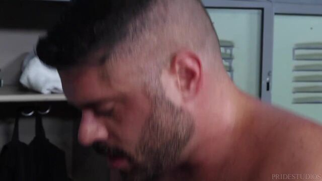 Riley Mitchel and Max Romano passionately kiss each other in the locker room. It doesn't take long for the cocks to come out and for Max to get his ass fucked!