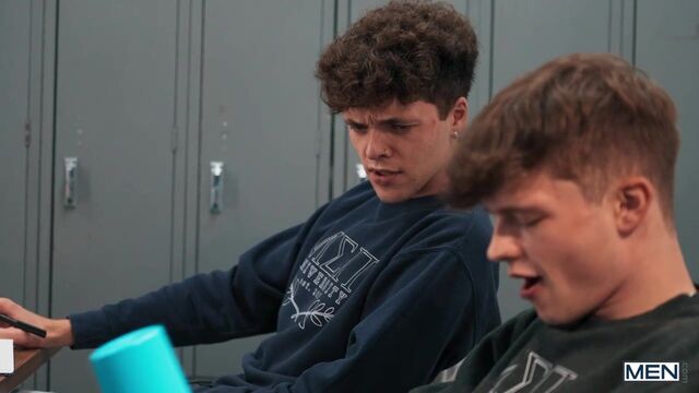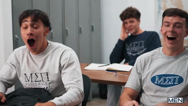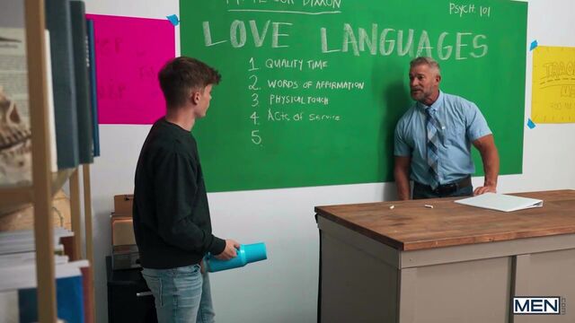 Frat bro Jake Preston isn't ready to concentrate on learning first thing Monday morning, so while Professor Greg Dixxon lectures at the board, he takes the top off his coffee mug-shaped stroker and starts fucking it! His seatmate Troye Dean reaches over to help him out, but when Greg sees Jake's hands in the air, he thinks the twink is volunteering. He calls Jake up to the board and catches him with the stroker on his dick, ending up with a face full of Jake's cum. It tastes so good, he orders the other students out and sucks Jake's cock, then tells him to use his hole. Jake bends the prof over his desk, then Greg rides his cock. The professor cums as Jake drills him on his back on a table, then gets down to take more of the student's jizz on his face!