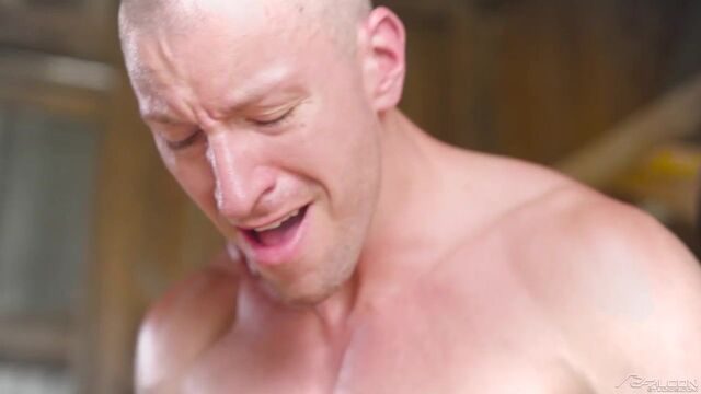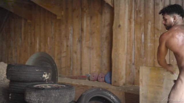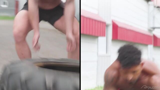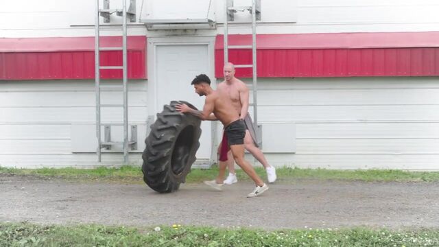 Losing a muscled-up tire-flipping competition with Kenzo Alvarez soon has Cam Crawford on his knees and sucking down Kenzo's stiff cock. Playing hooky from work, the two keep the action going as they suck and fuck outdoors and inside a large unused storage facility. Sweat pours down Kenzo's ripped body as he pounds his big bareback dick into a jockstrap-clad Cam until he's ready to pull out and bust all over Cam's smooth bubble butt.