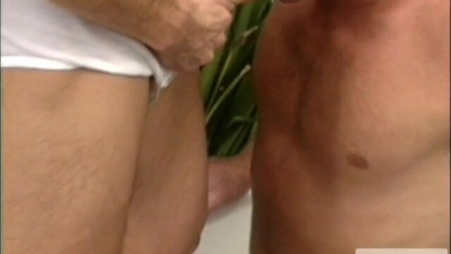 Dave Russell and Adam Rom get clean in a soapy outdoor bath. Rom stretches his ample foreskin while sucking on Russell's cock. Russell gives it back to Rom and then some, sucking his cock 'til the casing is taut against Rom's sausage. Russell wants more than a wet mouth though and pushes his cock deep into Rom's asshole.