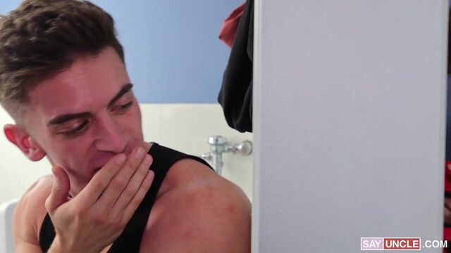Embarrassed about changing clothes in the locker room in front of the boys, Skylar decides to use the bathroom stall instead. The skinny blonde twink is getting naked in the stall when he realizes that he took some jock’s used underwear instead. Aroused, he starts sniffing the garment and jerking off to his small. His luck runs off when Trevor, a problematic bully from his class, catches him. The menacing hunk pulls Skylar out of the stall and starts torturing him. Skylar feels both defenseless and horny about Trevor’s actions and his blood rushes into his cock. Noticing how horny Skylar is, Trevor forces him to gag on his cock. Skylar swallows Trevor’s dick as if he had no alternative, but secretly, he enjoys every inch of his bully’s throbbing meat. Bullying becomes an intense fuck session when even Trevor is turned on by the situation and decides to lick Skylar’s hole. What started off as a threat becomes a secret between the two schoolboys as the straight-ish jock enjoys pounding the loser’s cock-starvin’ asshole.