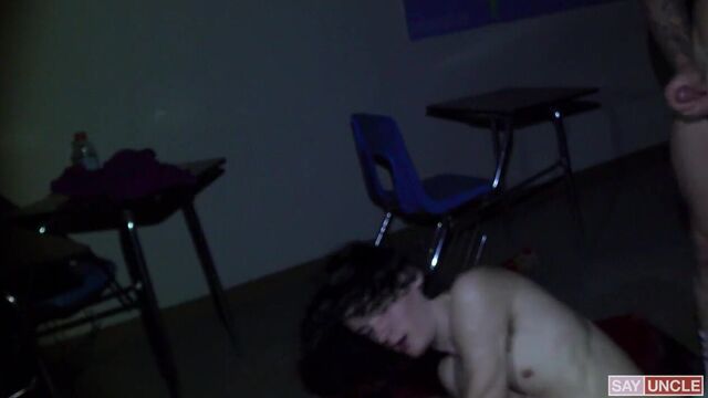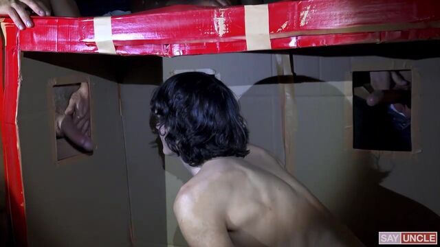 Dee has just signed for a new club and he couldn’t be more excited. He follows the instructions given by the other member and looks for an abandoned classroom in a deserted building. When he arrives, he finds Brooks, Shadow, and Johnny waiting for him without their shirts and their cocks out in the open. A shiver falls down Dee’s spine while his blood rushes to his dick as the three horny men grab the innocent new member and commence the hazing ritual to welcome him to the Pig Bottom club. They quickly get Dee off his clothes and trap him in the glory holes box, a device created to feed the new pig bottoms with as much man meat as possible. Fear quickly transforms into excitement as Dee enjoys the multiple cocks slapping his face. Yet, they’ve only just begun, as this club is known for fucking their new members' holes until they have the right amount of cum to shower their new joiner.