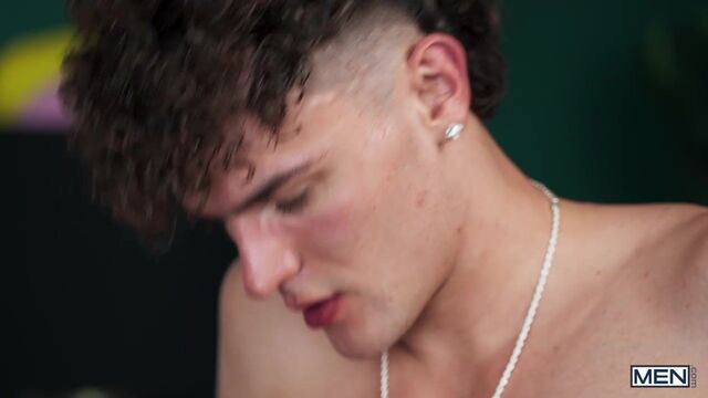 It seems like everyone in the frat house is horny today, and Joey Mills is the only one trying to study. He tells Aaron Elias he can eat his ass as long as he doesn't interrupt his reading, but once Aaron lubes up his cock and starts sliding it between his cheeks, Joey goes to the kitchen for some quiet. That doesn't last long, as Jake Preston gets hard seeing Joey with no pants, so Joey lets him fuck his armpit! Aaron comes in and fucks the other, but when the guys both jizz all over his book, it's clear no more studying is happening. Instead, Joey gets spit-roasted by the frat bros, and takes two thick loads on his face.
