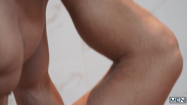 Sumner Blayne is in the bathroom when Ashton Summers comes up behind him and begins dominantly kissing him, turning him on before his shower. The guys strip off their briefs and stand under the spray, and Ashton presses Sumner into the wall, reaching around to stroke his cock. Sumner sucks the top, then Ashton grinds against him before fucking him standing up. Ashton lies back on the edge of the tub for Sumner to ride him, then puts the blond bottom on his back to pound his hole till he orgasms. The dark-haired top pulls out and gives Sumner another shower!