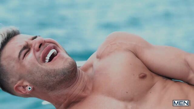 Allen King is taking in some sun on the cruse as he lies out on deck in his tiny swimsuit. Dom King gets horny checking out Allen's ass and strips off his shirt, asking to borrow some of the cute stranger's cream. Dom settles in on a cushion opposite, and Allen decides to have a little fun at the ship's prow, thrusting out his arms and yelling, "I'm the King of the Bottoms!" Dom comes up behind him, nibbling his ears and yanking down his swimsuit, then thrusting into his hole! Dom pounds the bottom in doggystyle, then Allen rides his cock as the ship bobs on the waves. The bottom shoots his load as he gets rawed on his back, and Dom feeds the seaman his semen.