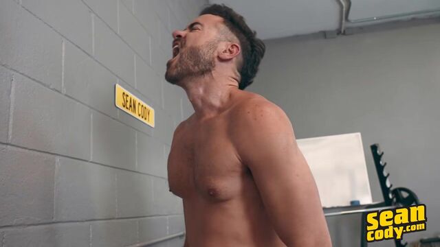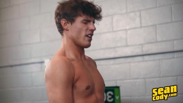 Almost as soon as he sees sexy twink Joey enter the gym, bearded Aussie hunk Holden strips off his shirt to show off his muscular chest. He checks out Joey as he stretches, and soon the cutie doesn't just take his own shirt off, he pulls down his shorts to flash his ass! "Come closer," Holden tells him, and the guys start kissing. Joey pulls Holden's cock out and strokes it, then sucks him, and Holden tells him to sit on his face so he can tongue his hole. Joey works up a sweat riding Holden on the floor, then the strong top gives it to him on a block before drilling him against the wall. He pulls out to cum on Joey's face, and the horny bottom jacks himself off.