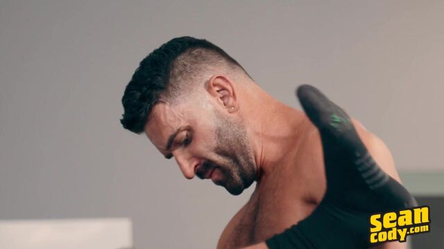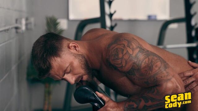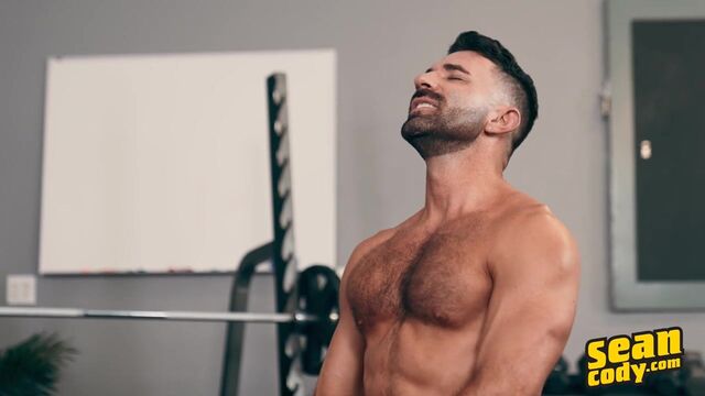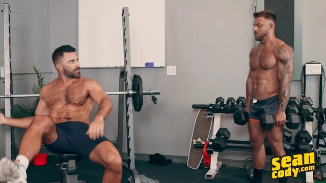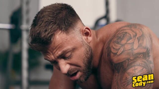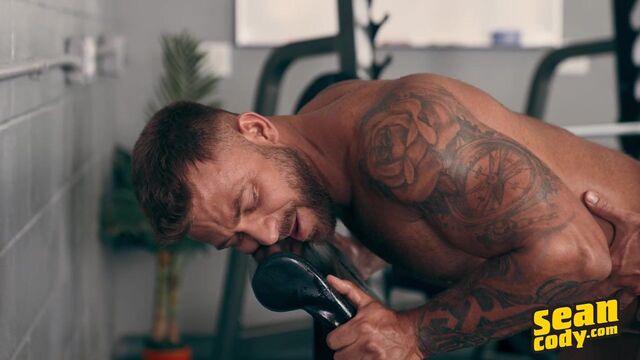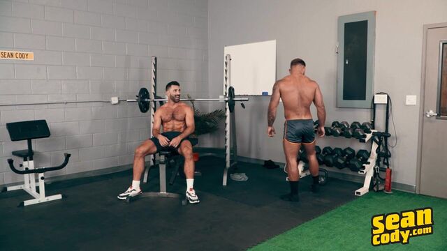 Levi and Scott split up when they reach the gym to take care of their workouts. Levi gets horny after his bench press and tells Scott, "I've got something for ya," pulling down his shorts to take out his big cock for the bottom to suck! Levi bends Scott over and licks his hole, then slides his dick inside. Scott sits on the top before getting fucked on the floor till he shoots his load, and Levi pulls out and cums.