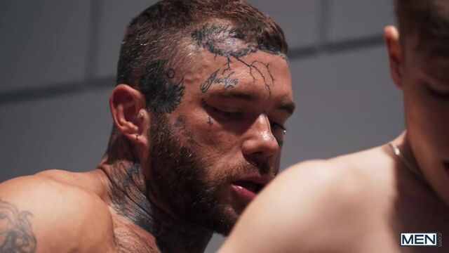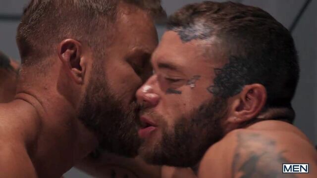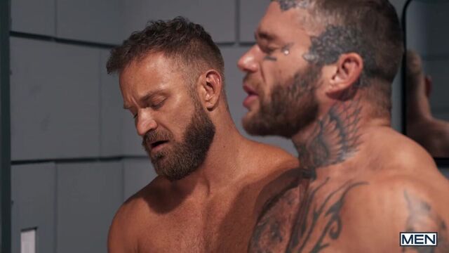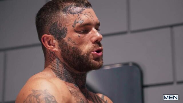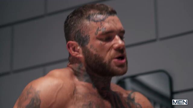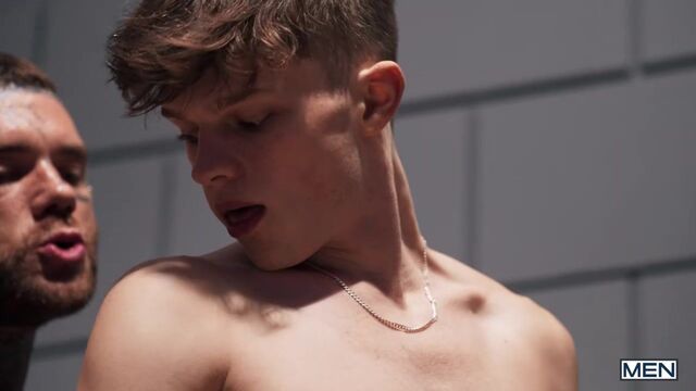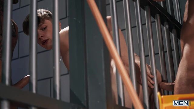 While the guard has his back turned, Joel Hart and Jake Preston start fooling around in the cell. Trusty Bruce Jones sees Jake sucking his celly and gets horny, telling the twink to put his ass by the bars so he can fuck it! The CO is getting some shuteye, so Bruce lifts the keys, but instead of trying to escape, he lets himself into the cell to join Jake and Joel for a threesome. Bruce sucks the guys and takes both their dicks as they spit-roast him, then double penetrate him. Jake takes the center spot of a train before he gets covered with cum.