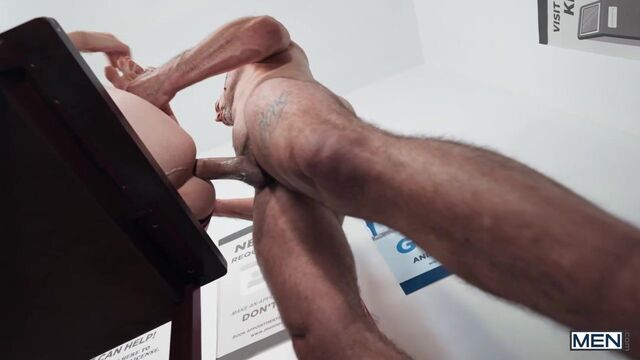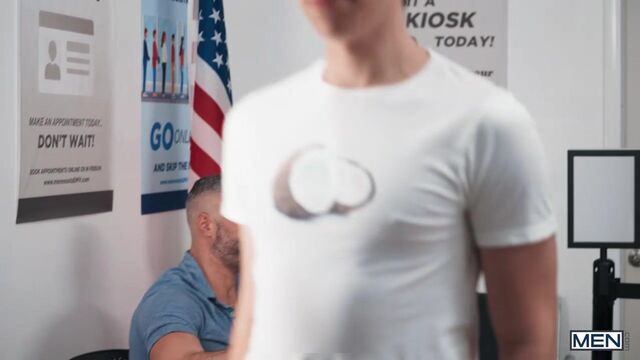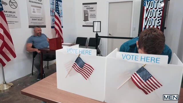It's erection--that is, election--day, and twink Joey Mills shows up to vote for the first time. Handsome poll worker Cole Connor flirts with him, and the sight of Joey's pink thong peeking over his jeans makes Cole take out his pole and stroke it! Joey trips and falls thrussy first on that cock, then the daddy rims him before taking him over the table. Joey rides Cole, and the top lifts him in a stand-and-carry. Joey orgasms as Cole drills him on his back. The poll worker empties his balls on Joey's face before counting some ballots!