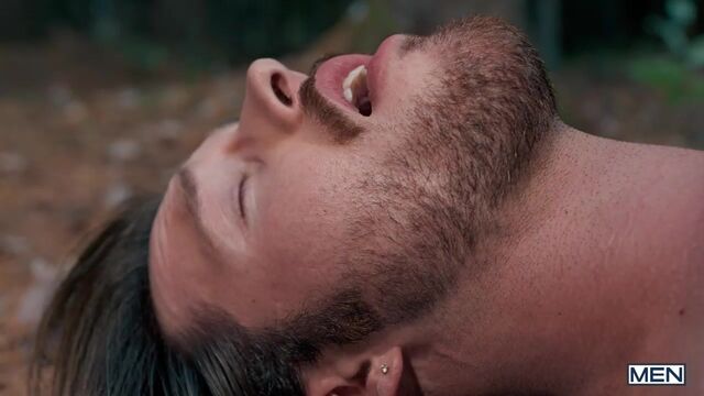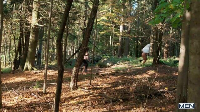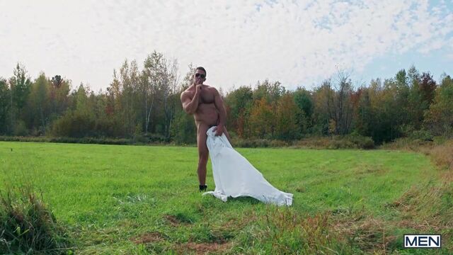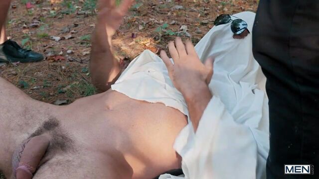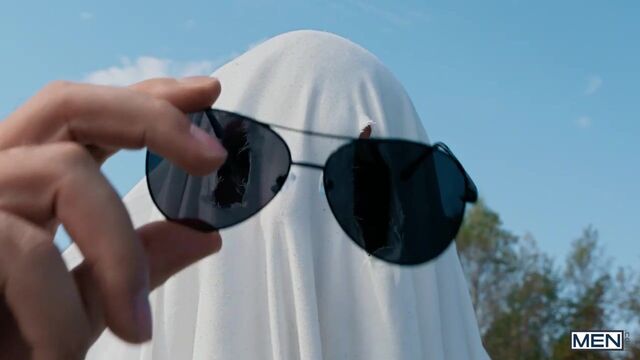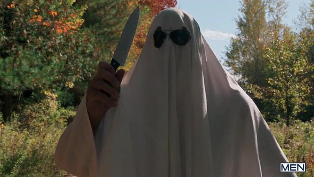 Chuck Conrad's Halloween trick is spooking people in his ghost costume, but he's also got a treat: there's nothing on underneath, so he can flash his big cock! After Chuck tries to scare some joggers in the woods, he loses a sheet, exposing that massive member, and the horny twinks turn the tables. Theo Dore and Benjamin Blue chase Chuck down, then rock-paper-scissors over who gets to suck that dick first. Benjamin wins, then it's Theo's turn, and he wins the next game for who gets to ride the top! Chuck nails Theo on the ground till the bottom nuts, then pulls out and shoots his load all over him. Now that's a Halloween treat!