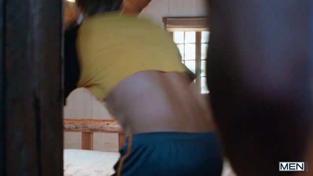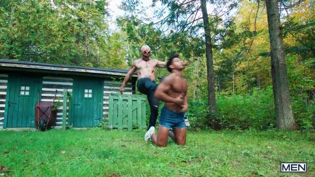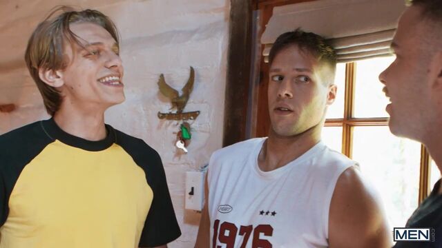The once quiet and peaceful Rainbow Lake Camp is filled with screams as the counselors witness a shocking crime, then flee for their lives! Arno Antino, Leo Louis, and Marcus McNeil barricade themselves into a cabin together, and their relief turns to more. The guys discuss how horny they are, and soon they're kissing and jacking each other off. Arno sucks the tops, and they form a rimming train before Marcus fucks Arno while Leo gets his cock sucked, then licks Marcus's hole. The tops spit-roast Arno and cum all over him... just in time for them to hear Finn pounding on the door. While he was running through the woods, he saw something unbelievable!