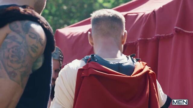 Senators Cassius and Brutus (Sumner Blayne) have chosen Spartacus as their champion, but they learn Caesar intends to poison him! The emperor's rivals hatch a plan to find a secret champion, the great Gallic warrior (Filou Fitt) who terrorized Caesar's army and slew a hundred legionaries single-handed. Brutus travels to the wilds of Gaul to take him back to Rome, but the muscular warrior isn't pleased at being taken captive... at least until Brutus explains this is a chance to help bring down Caesar. Brutus seduces the fighter with his body as well as his rhetoric, sucking the great Gallic lance. The massive top licks Brutus's culus and penetrates him, pounding the senator on his side and on his back till they both cum.