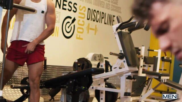 William Seed and Arno Antino are the only ones in the gym at this hour, making it even easier to check each other out. Arno notices William's hard dick poking out his shorts and just has to help himself to a taste of precum! William puts his face under Arno's ass at the squat rack, and soon Arno is sucking the top in the locker room. William pounds the bottom in doggystyle, and Arno rides that big dick. Both guys cum as William drills Arno on his back!