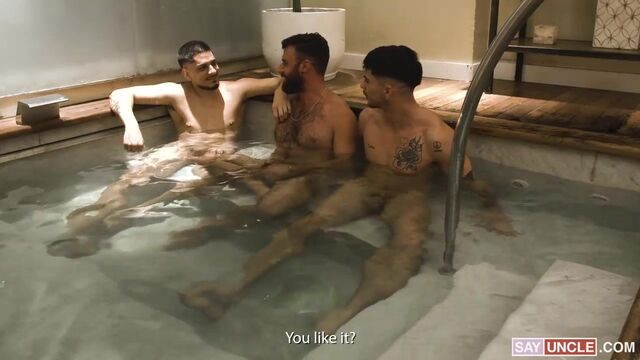 Rodrigo is loving his stay in the spa. Not only does he feel as relaxed as ever but he has also met Bastian, a handsome stud who shares his kinky taste in men. The two have been doing filthy stuff non-stop everywhere. The setting is perfect for them to indulge in their wildest fantasies, and the place is not crowded, so they get a lot of privacy whenever they feel in the mood. Yet, Bastian has been to the place many times before and knows that there’s a lot of raunchy stuff going on. One day, he decides to prepare a hot surprise for Rodrigo in the jacuzzi. When they arrive at the room, a young and sexy guy called Alexander is waiting for them. Bastian has been filling him in on all the fun that Rodrigo and him have been having together, and now, it’s time to invite him to join them and make the room even steamier…
