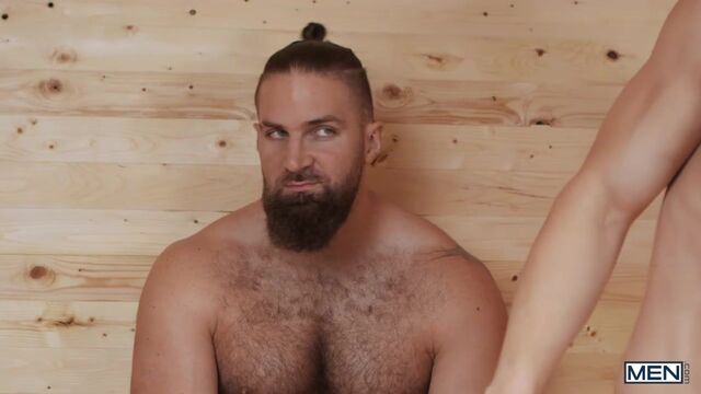 Chuck Conrad's girlfriend isn't pleased when she sees him checking out Michael Vente's ass in the sauna. As she relaxes with her eyes covered, Chuck spanks the stranger with the birch twigs, but she's annoyed by the noise. Michael decides to quietly suck the muscular hunk instead! Chuck's GF catches them and storms out, leaving the sweaty guys free to keep playing. Chuck fucks the bottom against the wall, then Michael rides his big dick on the bench. Chuck drills Michael till the bottom orgasms, then adds to his sweaty wet face with his load.