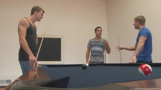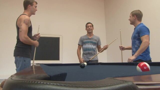 These three amigos are goofing around, playing some pool, and having a relaxed, good time with each other. DJ's not the greatest shot in the world, so when he takes aim at the 8 ball, TommyD sees an opportunity to capitalize. DJ agrees to take both Tommy's AND Christian Wilde's cocks in his ass at the same time if he misses the shot. Faced with the pressure, DJ chokes and totally blows it. That's not the only thing he ends up blowing!Christian and Tommy can't wait to collect on the wager, so they tackle DJ to the floor. Tommy slides his dick right into DJ's waiting mouth while Christian works DJ's dick into a throbbing frenzy. After they stuff him deep with a double penetration, DJ admits to missing the pocket on purpose! He wanted his pocket filled instead. Enjoy!