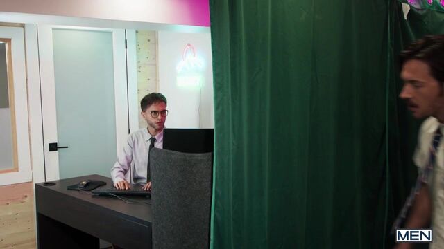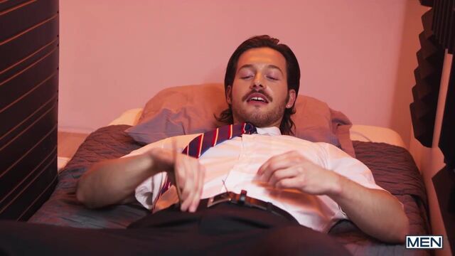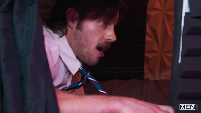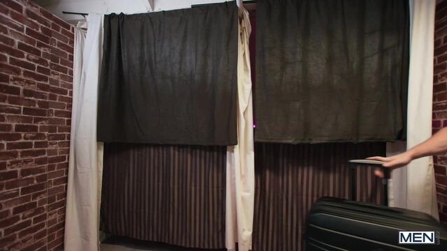 Airline pilot Harrison Feels is staying in a pod hotel for the night, and the quarters are small but private... or so he thinks. Fellow traveler Theo Dore is looking for his own pod and pulls open the curtain to see Harrison with his dick in his hand! Theo starts jacking off next door, then finds a hole between the pods to peek in at Harrison, and the pilot says he can suck it if he likes it so much! Theo is pleased to oblige, then Harrison comes around to fuck the bottom doggystyle. They fuck in the pod in spoon position, then the pilot drills Theo out in the open till he orgasms before cumming on the bottom's face.