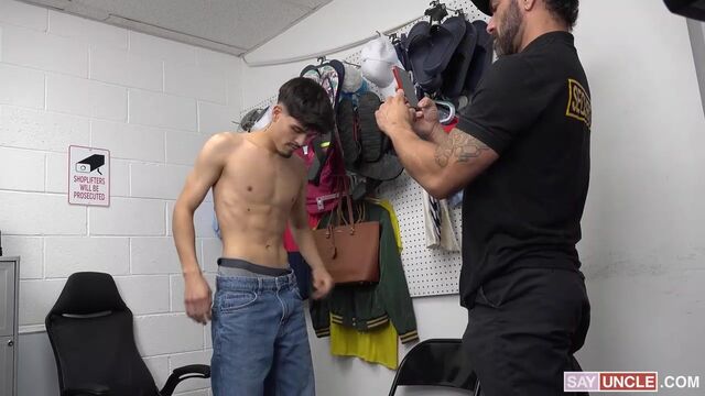 Fernando, A mall graffiti artist, is caught spray-painting on the mall’s premises, prompting security guard Ramzi to bring him to his office for questioning. Fernando has two strikes already, but he couldn’t care less about the consequences, so Officer Ramzi decides to take on a different approach with him. If he loves spray-painting his opinions over private property, then won’t mind if the officer labels him as his fuck toy and takes some pictures to humiliate him. Fernando keeps his face straight while Adam takes photos of him, secretly enjoying the power struggle with the hot security guard. Adam soon realizes that Fernando likes tough discipline, so he pulls out his cock and presses it against the perp’s dick. The sexual tension is finally released as Adam kisses the boy passionately and forces him to suck his dick to show him what happens when you don’t play by the rules.