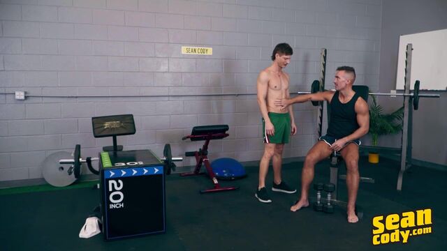 Joey's doing some bicep curls in the gym and has the perfect view to check out Ryan as he works out right in his line of sight. Ryan notices the attention and takes off his shirt to give him a better look! The guys start kissing and touching each other, and Ryan gets on his knees to suck the top. "You wanna ride it?" Joey offers, and Ryan accepts with a "Hell yeah!" The bottom tells Joey to bend him over and fuck him doggystyle, then Joey fucks Ryan on his back on a block till he orgasms before adding his own hot load to his abs!
