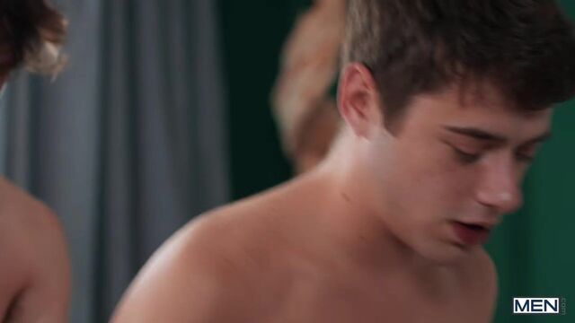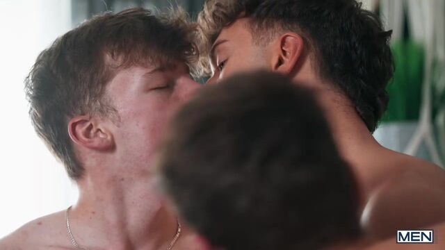 When Finn August peeks in the door, he thinks he sees his BF Jake Preston self-sucking, so he helps out, licking the balls. But when he starts to finger "Jake's" hole, he's shocked when Joey Mills moans! Jake was 69ing with the bottom, so Finn joins in. Together Finn and Jake spit-roast Joey, then Joey sucks Finn as he rides Jake. Joey and Jake take turns stretching Finn's hole before forming a train. Jake stacks Joey and Finn and fucks them till he cums, then he's ready for their nuts!