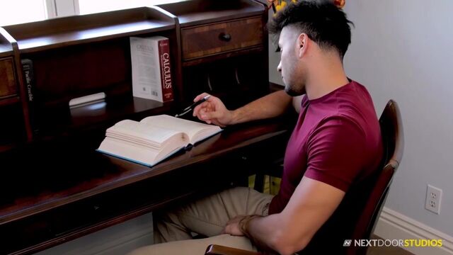 Hunter Knox has been hitting the books hard all day and he deserves a nice needed break. Once the pen hits his lips his hand begins to wander underneath the desk. He slowly gropes his growing wishing he was in class so maybe someone would notice. He begins to unzip his pants revealing his huge thick uncut cock. Hunter's dick is a handful. He moans quietly pretending that he is in class as his big dick becomes harder and harder throbbing in his hands. He shows off his body as he rubs his chest with one hand and the other continues playing with his cock and balls. He can only stroke that sexy cock for so long and his balls have become full and soon enough he shoots a thick load of cum one after another and it oozes all over the tip of his uncut cock.