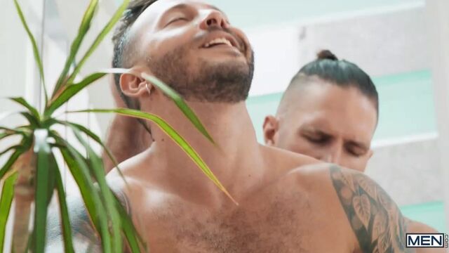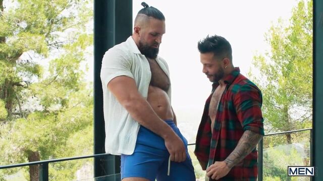 Chuck Conrad is enjoying the sun and fresh air on the balcony so much, he unbuttons his shirt to feel it against his skin. John Brachalli joins the tall, muscular top and helps him feel even better, touching his chest and then nuzzling his bulge through his shorts. Chuck fucks the bottom's face, then they head inside where John rides him in a rocking chair. Chuck bends the bottom over against the stairs, then carries him, still fucking him, up to the landing where he slaps his ass as he drills his hole. John cums as he gets railed from behind against the railing, then sucks out the top's load.