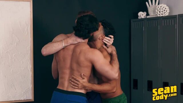 Diego and Paul think their workout partner Lucas is super handsome, and the tall redhead is thrilled to be sandwiched by the dark-haired hunks in the locker room. The guys undress, and Lucas and Paul kiss hungrily while Diego gets to his knees to suck Paul, then Lucas kneels to take his turn. Lucas rims Diego and the tops spit-roast him, then the redhead shoots a load on Diego as Paul drills the bottom on his back. The dark-haired top pulls out and cums, and Diego jacks himself off.