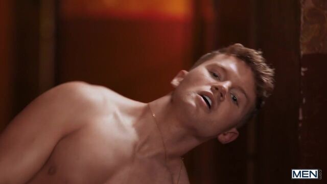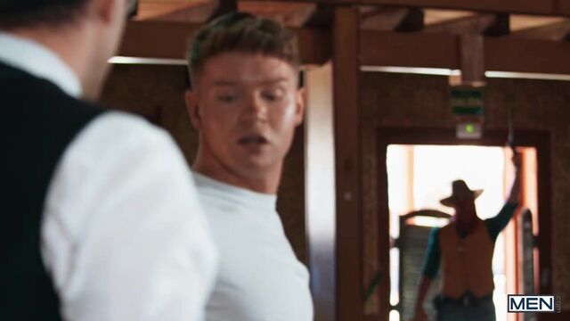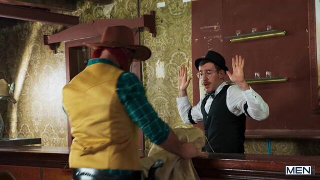 Modern twink Dean Young doesn't hesitate when he finds a futuristic helmet in a package on his desk, trying it on... but he's suddenly transported to an Old West town. Bemused, the hunk strolls down the street and through the swinging doors of the saloon. Barkeep Charlie Cherry has no idea what Dean is talking about when he asks for a rideshare, but when an outlaw robs the place, he pulls Dean to safety behind the bar. Dean sees Charlie's bulge and sucks him while the barkeep loads the money in a sack, and once the robber leaves, the men 69 and fuck on the bar. Charlie leads the time traveler to the stairs, and they have a gay old time as he drills him from behind and on his back, then rides the top till he orgasms. But while Dean is cleaning Charlie's cum off his face, the barkeep finds the helmet and puts it on...