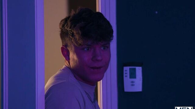 Streamer Noah Way has a special treat for his fans: he shows off a cosplay outfit, props, and his hot body. Noah starts humping his big sword and sucking on the pommel, unaware his roommate Drake Von is peeking in from the door. The t-guy's chat warns him someone's behind him as Drake comes up with his hard dick out, and Noah eagerly sucks it. The chat want to watch Noah get fucked, so Drake licks him, then pounds him in missionary and doggystyle in his gamer chair. Noah shuts off the stream so he can concentrate on getting drilled in spoon and riding Drake's big dick on the bed before the top pulls out and cums.