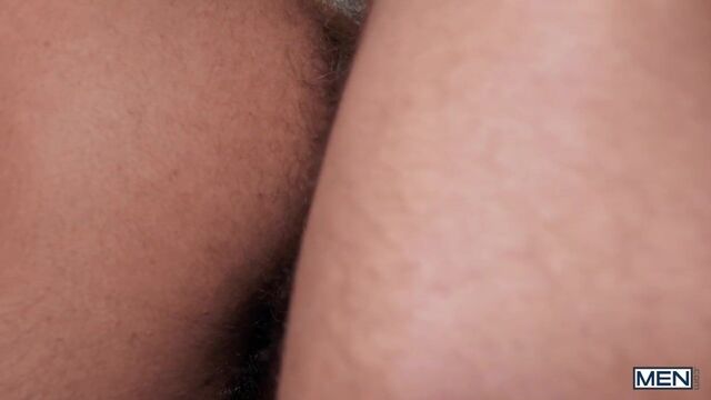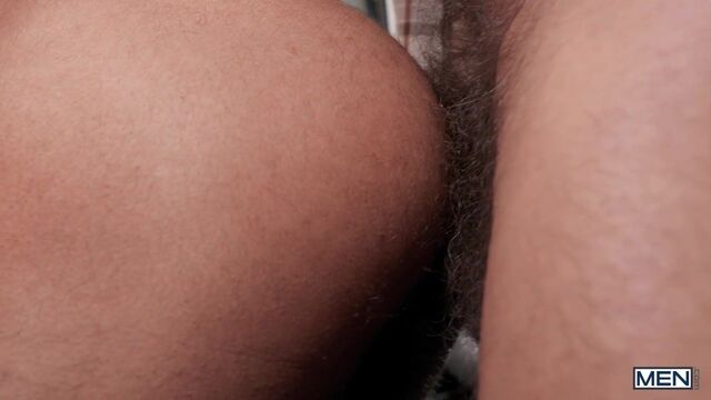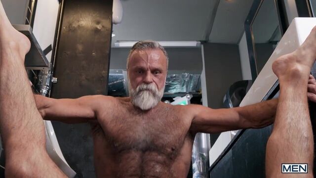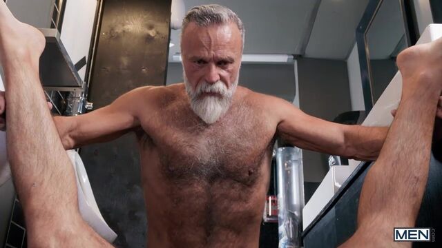 Silver-haired bear Daddy John checks that the stalls are empty before he takes out his dick to use the urinal. Dark-haired Ali Rush sidles up next to the daddy and checks out John's dick, and the bear checks him out right back. John nuzzles and sucks the college guy's cock, and they frot before Ali sucks the top. Daddy John fucks the bottom against he wall, and Ali rides him on the floor, then gets dicked deep in doggystyle and creampied in piledriver. The silver fox fingers his hole as Ali strokes himself till he cums!