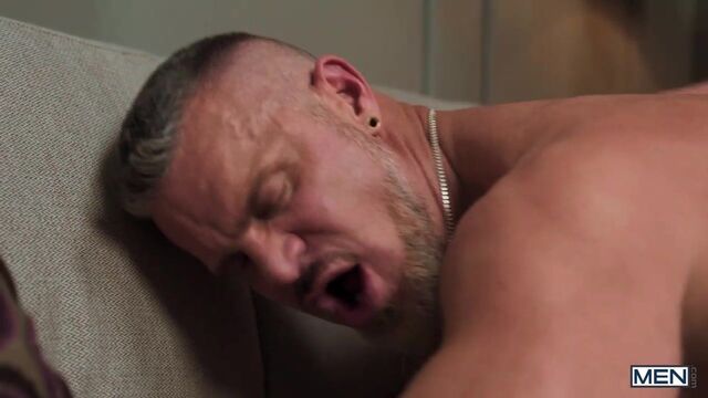 Dom King and Landon Conrad's muscles contract and ripple as they strip off their shirts while they kiss hungrily. Landon worships Dom's arms and chest as he flexes, and the guys suck each other before Dom pounds the bottom on the couch. Landon rides the top, then takes it deep on his back till the hunks cum.
