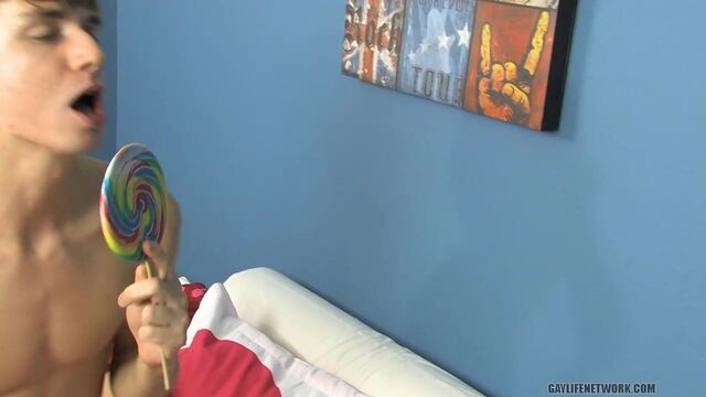 Nathan Stratus ordered a big package and it finally arrives. He gets a huge, juicy lollipop that he says is an orgasm with every lick! Him and Chad Hollywood try it out, licking and sucking on it together. They erupt into a hot frenzy of twink fucking, with Chad taking the lead and bending Nathan over to show him what an orgasm really feels like.
