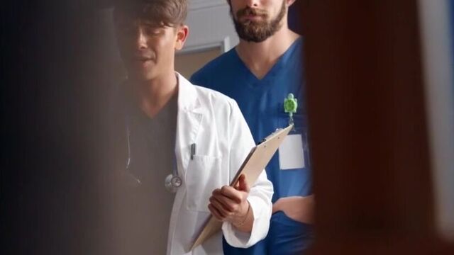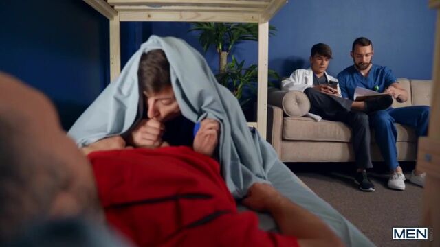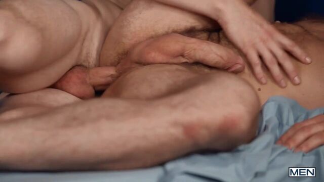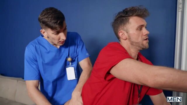 It's been a hard day at the hospital for nurses Michael Jackman and Blaze Austin, and it's only with each other's support that they've made it through. The nurses share a tender moment in the on-call room as they thank each other for being there, then start passionately kissing as things start getting McSteamy! Michael bars the door as he bends Blaze over and pulls down his scrubs to pound him in doggystyle... until a tired doctor tries to come in and catch some winks. Blaze quickly gets into the bottom bunk and Michael hides under the blanket so he can suck Blaze's dick as the doctor is none the wiser. Once the other man is ensconced in the top bunk, Michael fucks the bottom spoon, and the guys even risk some doggystyle before Blaze rides Michael's cock and takes a big facial!
