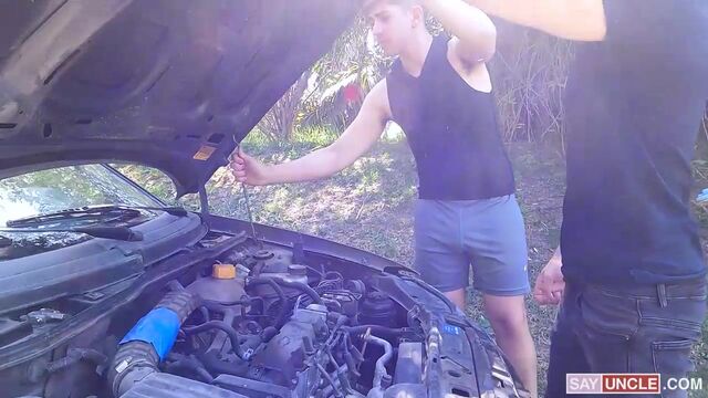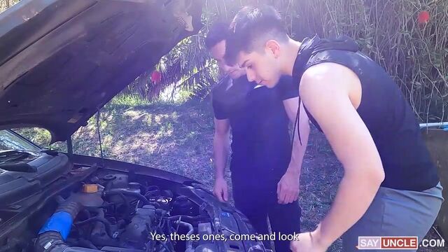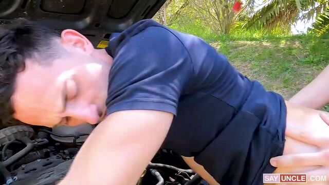 Matt’s car has been malfunctioning all day long. Driving clients around hasn’t been easy today, as the engine has been giving him trouble since he started working today. But he can’t afford to go to the mechanic and lose a whole day’s work, so he can only hope for the best and try to make it to the end of the afternoon to make enough money to take the car to the shop. Lucky for him, his next passenger, young Leon, is a mechanic, so he is happy to take a look at Matt’s engine. Upon closer inspection, Leon notices that the radiator is not working properly and that his driver has a gorgeous piece of ass. Leon doesn’t mind repairing Matt’s car and he doesn’t really expect to get paid for it, but he wouldn’t mind getting a taste of the driver’s booty in exchange for his service. Tempted by Leon’s meaty offer, Matt gives Leon’s cock a ride to remember.